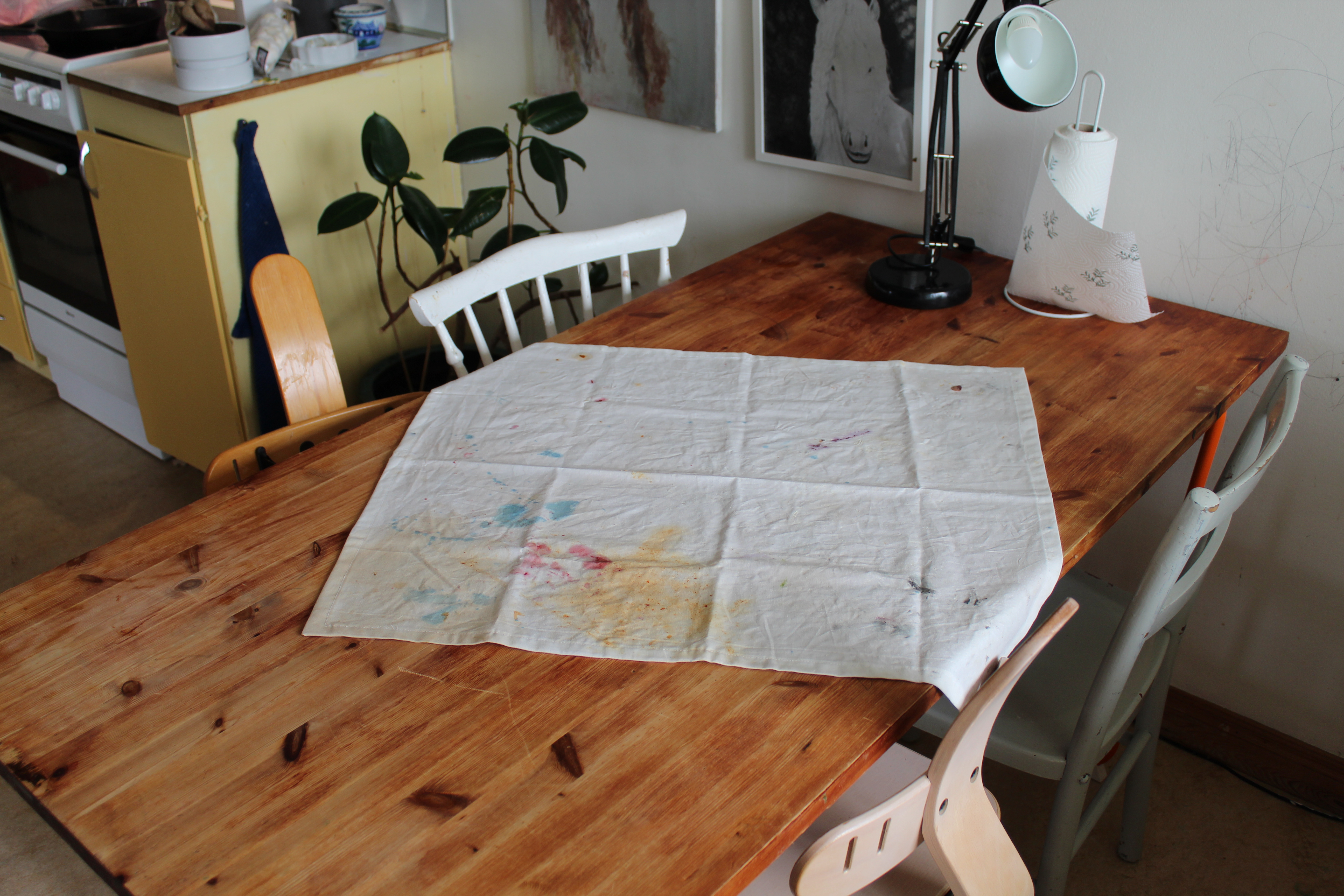 The never-ending circular motion of bodies getting dirty and then bathed, clothes getting stained and then washed, the living room floor filled with toys which are then picked up again, just to be thrown all over the place once more within an hour caused me to initiate my work Dirt and Dignity. In the project, I use processes of pollution in order to produce sculptural objects. This act of letting pollution become part of an artistic method is used to visualize hierarchical differences between different sorts of production and mark-making. Playground sand collected from my children’s sneakers, a stained table cloth, and cut-outs of stains left on a plastic floor mat are examples of materials and processes used in the project. The method of autotheory is used throughout the artistic process to research and regard these mundane situations through a theoretical and philosophical lens. The esthetic choices are then informed by different sets of theory relating to the specific derivative action or situation. The sculptural objects are placed back into the situation from which they derive where they are activated in different ways by the different inhabitants of the apartment. The cat scratches her claws against one object, and falls asleep on top of another, the children use them in their play. And I move them around and clean them, an ouroboro is created.